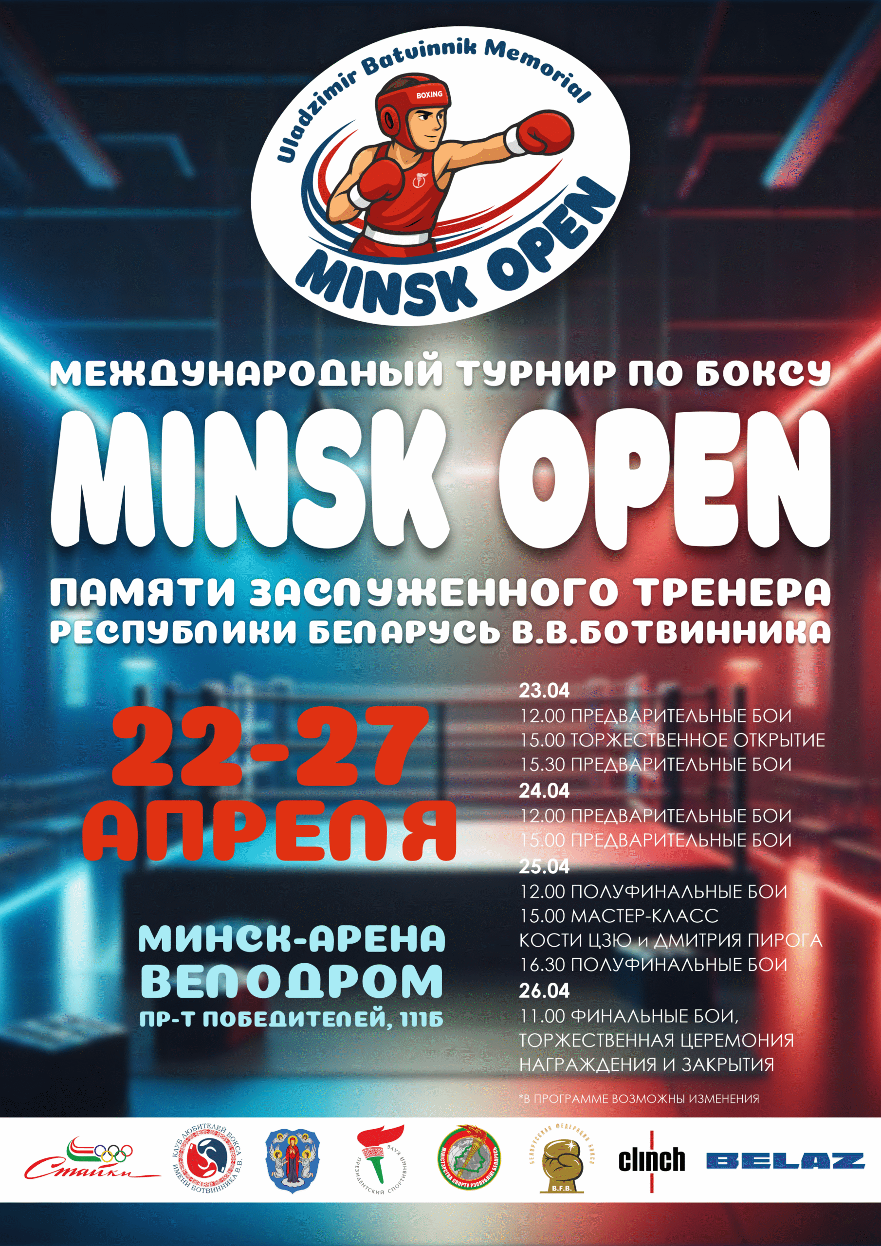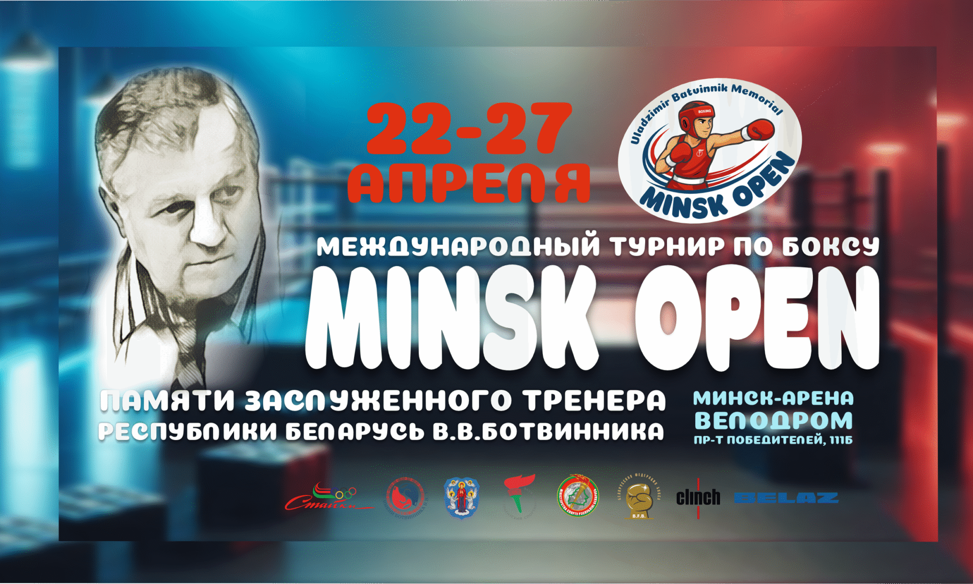 ⚡Международный турнир по боксу «MINSK OPEN» памяти Заслуженного тренера Республики Беларусь Владимира Владимировича Ботвинника пройдет с 22 по 27 апреля 2026 года в г.Минске на базе велодрома МСМК «Минск-арена» (пр. Победителей, 111Б).