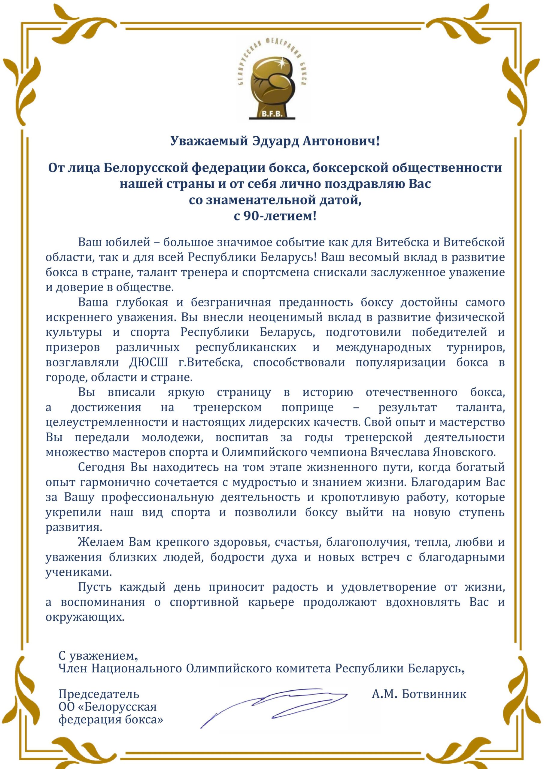Заслуженному тренеру Беларуси (1988), подготовившему и участвовавшему в подготовке шести мастеров спорта и Заслуженного мастера спорта по боксу.